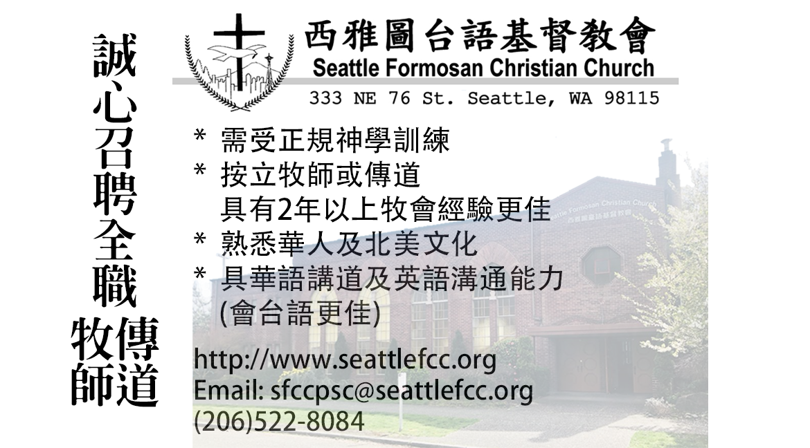 若有意願,請到西雅圖台語基督教會網路 (http://www.seattlefcc.org) 了解教會聘牧資訊,並將申請信和履歷表電郵至 sfccpsc@seattlefcc.org。